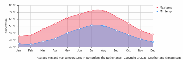 Rotterdam má mierne oceánske podnebie podobné všetkým pobrežným oblastiam v Holandsku. Nachádza sa blízko pobrežia a klíma je tu o niečo miernejšia ako vo vnútrozemí.